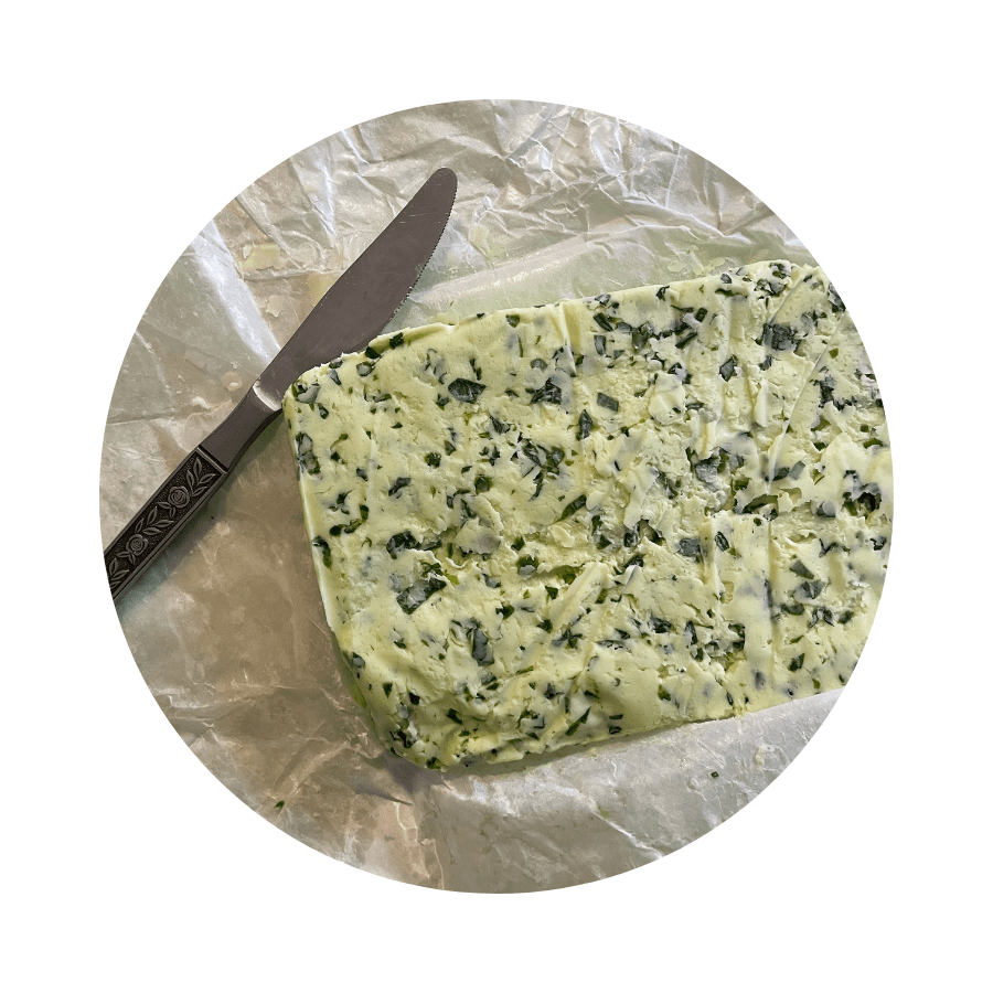 - In a bowl, mix the softened butter, chopped leaves, and salt.